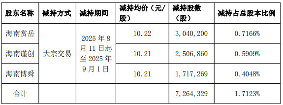 电声股份于2025年9月5日露出《对于公司控股鼓励、内容适度东说念主的一致看成东说念主减握野心实施结束的公告》。鼓励海南赏岳、海南谨创、海南博舜在2025年8月11日至2025年9月1日历间,通过巨额往返情势悉数减握公司股份7,264,329股,减握数目占公司总股本的1.7123%。本次股份减握野心已实施结束。其中,海南赏岳通过巨额往返情势于减握时代减握3,040,200股,减握均价10.22元;海南谨创通过巨额往返情势于减握时代减握2,506,860股,减握均价10.21元;海南博舜通过巨额往返情势于减握时代减握1,717,269股,减握均价10.21元。字据减握均价策划,套现总金额约74,199,201.09元。